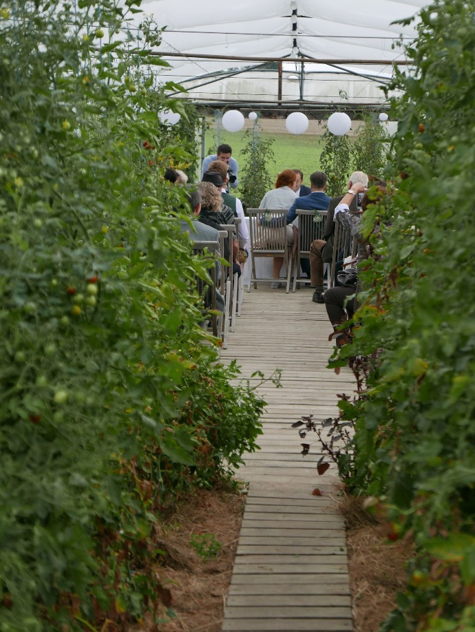 Falls das Wetter für den Trauungsplatz unter der Weide zu windig, zu kalt oder leicht regnerisch sein sollte, gibt es die Möglichkeit ins Gewächshaus auszuweichen. Dort gibt es zwischen den Gemüsepflanzen eine grosse Holzterasse, auf der ebenfalls ca 50 Personen Platz finden. Ein ganz neuer Rahmen, um sich das JA-Wort zu geben!.