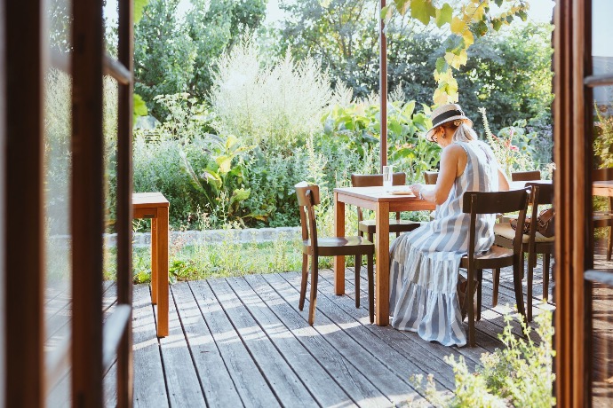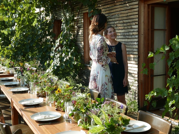 Eine Holzterasse inmitten unseres Gewächshauses bietet Platz für ca. 30 Personen (bei Tisch) zum gemeinsamen Feiern! Tatsächlich sitzen sie zwischen rankenden Pflanzen und bunten reifen Früchten. Besonders stimmungsvoll am Abend bei Kerzenlicht...!