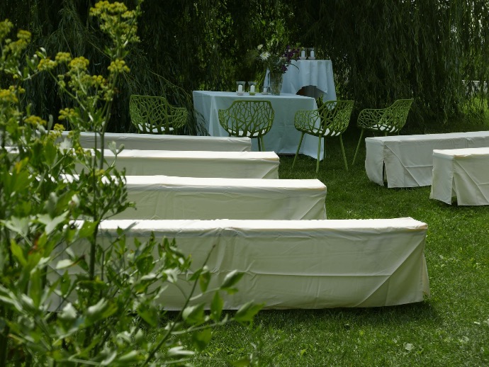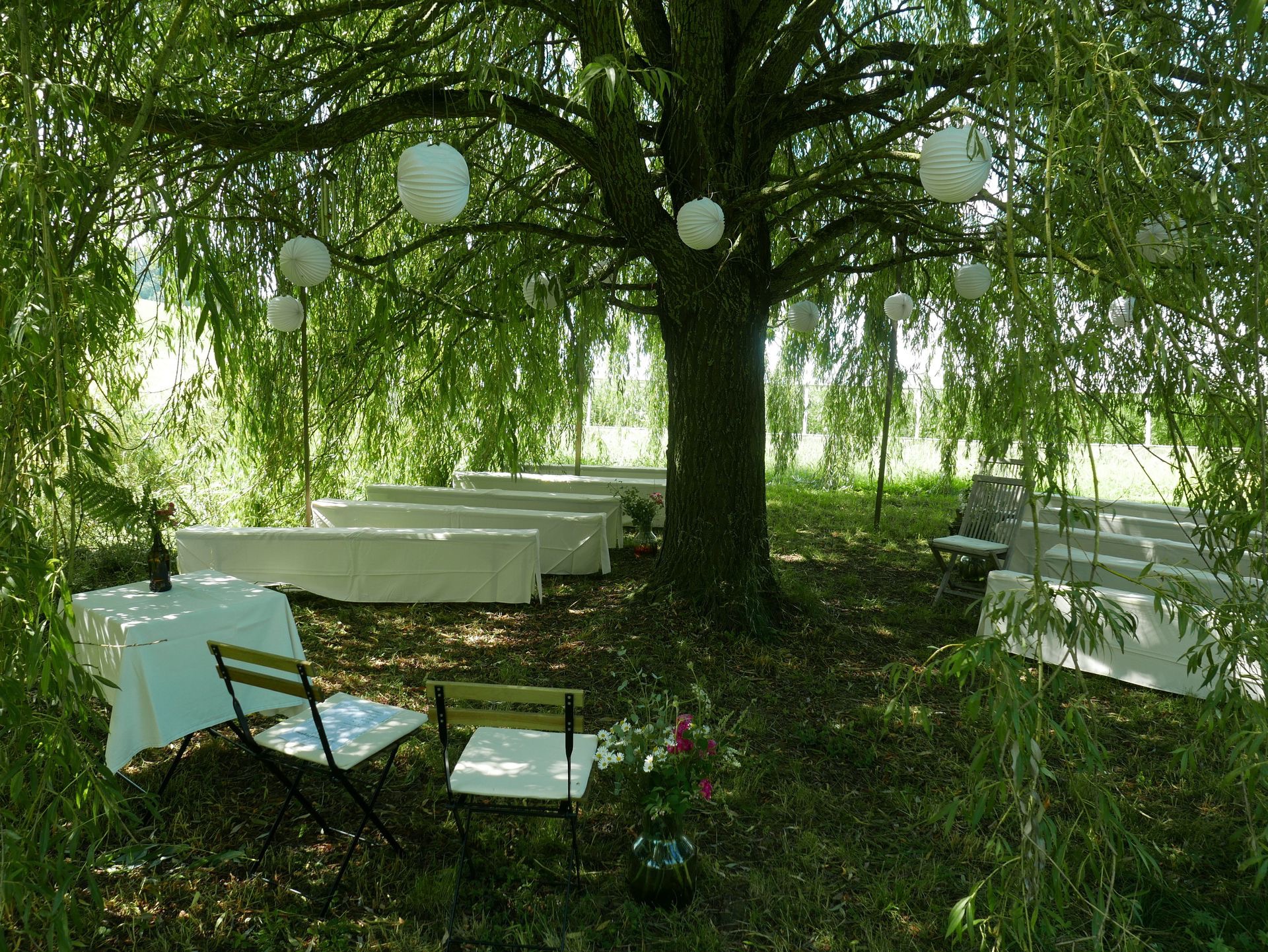 Die Hochzeitsgäste finden unter unserer Weide Platz, ideal, da sie ein angenehmes Wohlfühlklima schafft - auch an sehr heissen Sommertagen!
