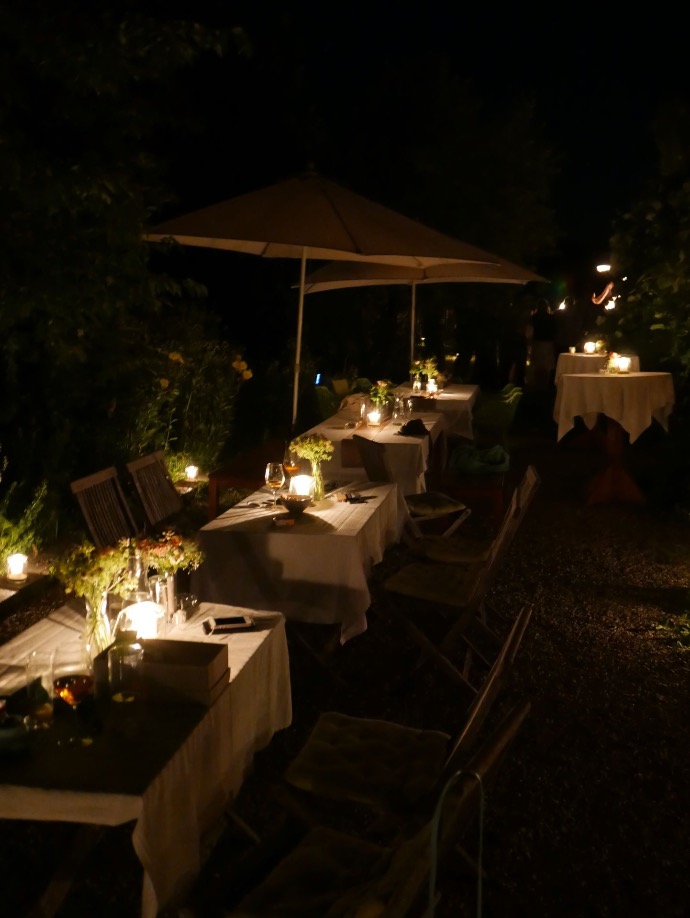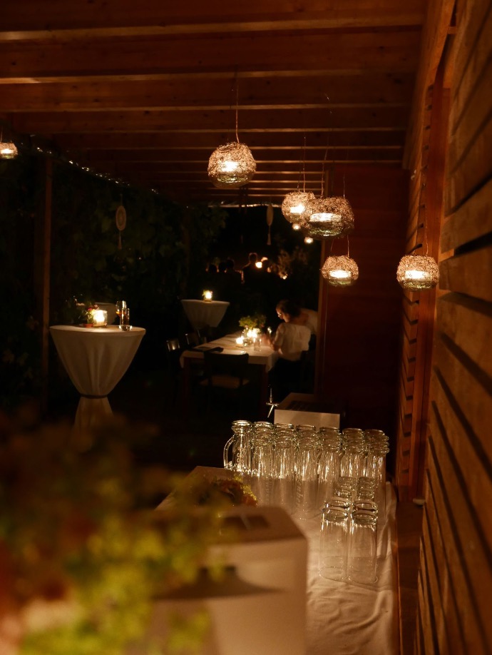 An lauen Sommerabenden nach dem Festmahl an der Tafel werden Stehtische unter der überdachten Terrasse oder auch einige Plätze unter freiem Himmel sehr gerne zum Anstossen, Lachen und Feiern frequentiert. Ganz bewusst verwenden wir vorwiegend indirekte Beleuchtung und vor allem Kerzenlicht, um den Abend romantisch und stimmungsvoll ausklingen zu lassen.